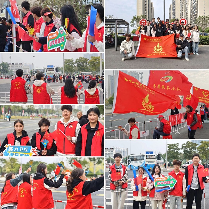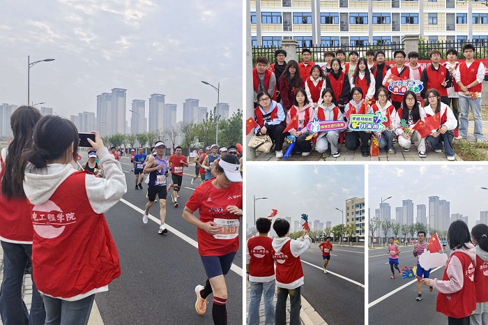 2024孝感马拉松共设有马拉松(42.195公里)、半程马拉松(21.0975公里)、孝爱欢乐跑(约6公里)3个项目。全程马拉松取道沿河南路,经过我校南校区。全校两万多名师生、教职员工,或通过线上直播收看比赛盛况,隔着屏幕送上祝福为跑友们鼓劲、“打CALL”;或在赛道两边,热情洋溢的为选手加油助威。