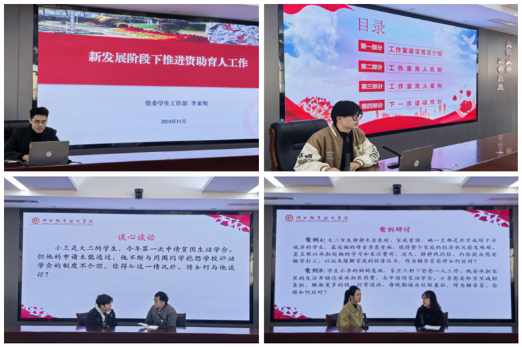 本期沙龙围绕资助育人工作,分思想引领、经验交流、谈心谈话和案例研讨展示四个环节。党委学生工作部学籍资助科科长李来斯以《新发展阶段下推进资助育人工作》为题,深入分析了新时代资助育人工作的新要求、新挑战、新定位,从优化资助方式、精进工作能力、提升育人情怀三个方面,助力贫困学子追梦圆梦。辅导员程思齐以《心手相牵,成长相伴——打造资助育人长效机制》为题,从资助育人案例视角,分享了将资助工作与学生的思政教育、学业辅导、心理健康等有效结合的经验做法,助力学生全面健康成长。辅导员叶华新与学生现场展示了谈心谈话,辅导员苏莹和梅运悦模拟了AB角案例研讨。