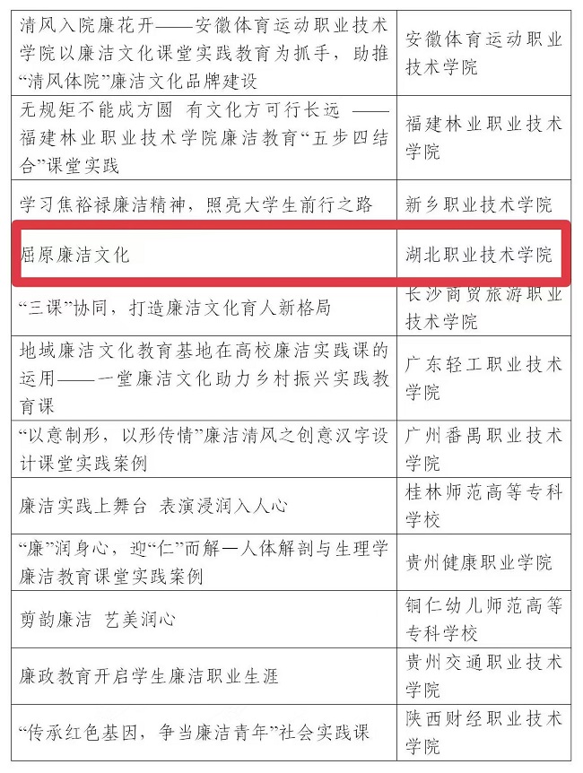 (本网讯 轩传)根据《教育部办公厅关于举办第九届高校廉洁教育系列活动的通知》(教思政厅函〔2024〕9号)工作安排,经学校动员、省(区、市)推荐、专家遴选,我校党委宣传部陈灏主持的《屈原廉洁文化》入选全国高校廉洁教育系列活动“课堂实践”案例。我校是湖北省在“课堂实践”单元唯一入选的高职院校。