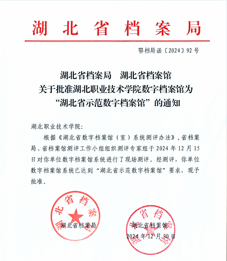 (本讯网 黄金荣 刘中华 罗琪 陈丹)经过湖北省档案局、省档案馆测评,我校数字档案馆被批准为“湖北省示范数字档案馆”。