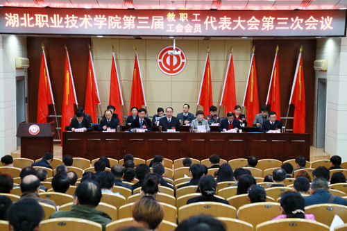 校长朱虹作了《学校工作报告》。报告指出,2015年在上级党委、政府和学校党委的正确领导下,全校教职员工发扬“团结拼搏、艰苦创业、改革创新、争创一流”的湖北职院精神,按照学校第三次创业的奋斗目标,进一步解放思想,开拓进取,全面完成了2015年各项工作目标和任务。报告明确提出“十三五”发展目标、主要任务及2016年重点工作。2016年工作目标概括起来就是“123456”:“1”是紧紧围绕“立德树人”这一个根本任务,“2”是实施学校“教育创新行动计划”和“管理水平三年行动计划”,奋力争全国文明单位、全国优质高职院校,“3”是着力实现人才培养水平提升、依法治校水平提升和保障能力提升,“4”是从严落实学校“四个全面”的要求即全面提升人才培养质量、全面提高管理水平、全面深化改革、全面加强党的领导,“5”是始终遵循“创新、协调、绿色、开放、共享”五大发展理念,“6”是推进六大工程即专业建设与教学质量提升工程、科技与社会服务提升工程、文化引领工程、体制机制创新工程、人才强校工程、校园建设与基础保障工程。
