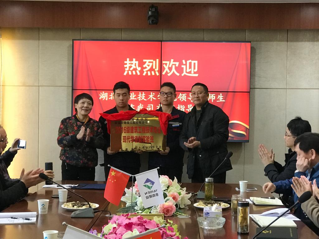 11月4日下午,秋高气爽,校长朱虹率领学校师生到武汉泰森浩建设公司,与泰森浩建设公司董事长刘志岩一起,为建筑工程技术专业泰森浩现代学徒制实验班揭牌。揭牌前,朱校长与刘志岩董事长签订了现代学徒制人才培养合作协议,并发表了热情洋溢的讲话,她指出,学校与泰森浩建设公司具有良好的合作基础,举办现代学徒制实验班是学校落实高职教育三年行动计划的重要内容,是破解顶岗实习难题建立产教融合长效机制的重要实践,是建筑技术学院实现特色发展的重要抓手,学校将全力支持、指导该项目深入推进,希望校企双方密切协作,努力探索中国现代学徒制的新形式,形成中国现代学徒制的新经验。
