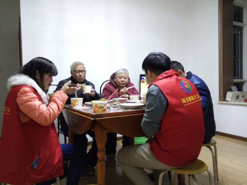 12月5日,是国际志愿者日。为了以实际行动庆祝这一特殊的日子,义工社“老年服务队”在队长黄金博的组织和带领下,赴万福新城开展了“爱心伴餐”志愿服务活动,孝感市文明办科长李新安、孝感市善孝志愿服务队负责人程猛、学校义工社党支部书记谭之平参加了本次活动。