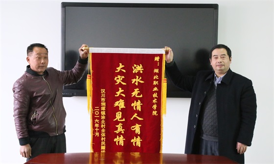 1月11日,汉川市垌冢镇党委副书记曾思元、涂北村支部书记倪德安等一行来校,分别将绣有“洪水无情人有情 奉献爱心显真情”的两面锦旗送到学校党委书记蔡诗红和校长助理、学校驻涂北村工作队队长田寿永手中,以此表达他们对学校全体师生的感激之情。
