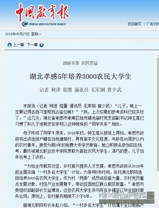 “为给全市脱贫攻坚、乡村振兴提供人才支撑,孝感市政府从2018年起全面实施‘一村多名大学生’计划,力争用5年时间,依托湖北职院选拔培养3000名农民大学生,作为村‘两委’成员或后备力量、农村党员重点发展对象、村级产业发展骨干,带动贫困地区群众脱贫致富。”孝感市委组织部副部长文益博说,这些农民大学生须与所在乡镇签订毕业回村服务合同,原则上,在村服务期限不少于5年。