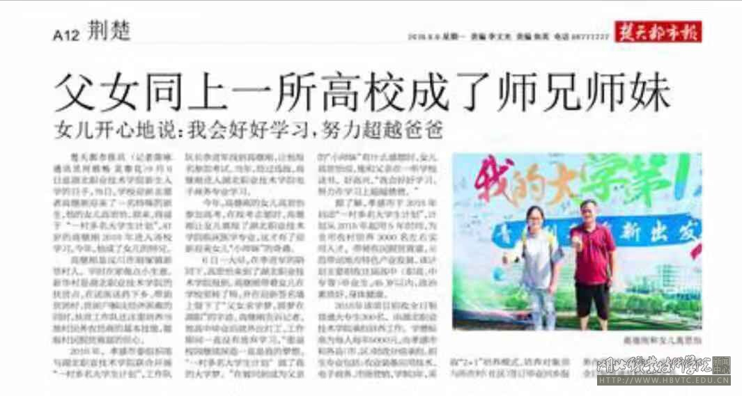 楚天都市报讯(记者陈咏通讯员何顺畅 吴春花)9月6日是多宝网页版新生入学的日子,当日,学校迎新志愿者高继刚迎来了一名特殊的新生,他的女儿高思怡。原来,得益于“一村多名大学生计划”,41岁的高继刚2018年进入该校学习,今年,他成了女儿的师兄。