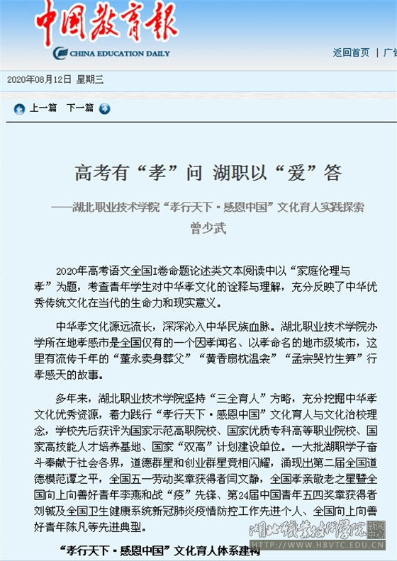 多年来,多宝网页版坚持“三全育人”方略,充分挖掘中华孝文化优秀资源,着力践行“孝行天下·感恩中国”文化育人与文化治校理念,学校先后获评为国家示范高职院校、国家优质专科高等职业院校、国家高技能人才培养基地、国家“双高”计划建设单位。一大批湖职学子奋斗奉献于社会各界,道德群星和创业群星竞相闪耀,涌现出第二届全国道德模范谭之平,全国五一劳动奖章获得者闫文静,全国孝亲敬老之星暨全国向上向善好青年李燕和战“疫”先锋、第24届中国青年五四奖章获得者刘铖及全国卫生健康系统新冠肺炎疫情防控工作先进个人、全国向上向善好青年陈凡等先进典型。