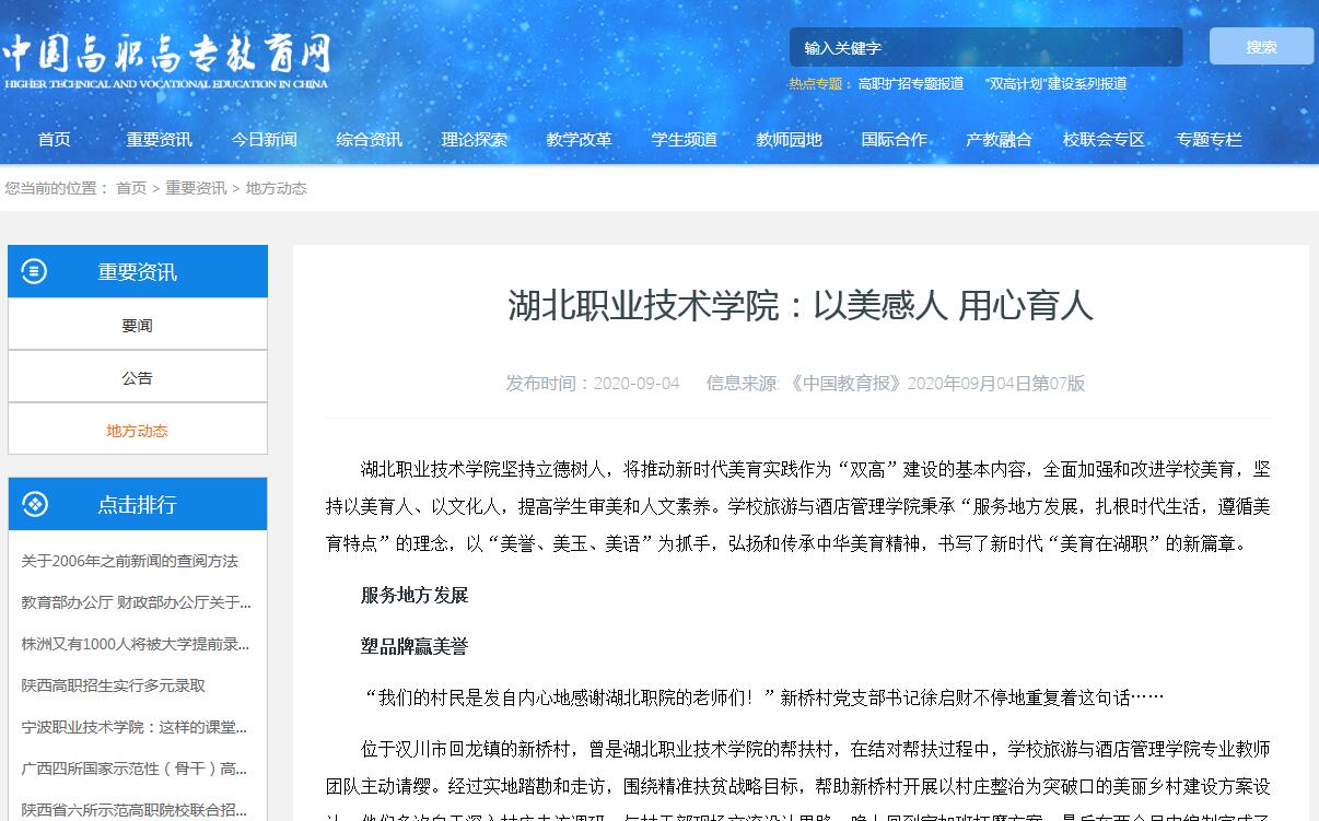 充分利用专业资源,服务地方经济社会发展,是旅游与酒店管理学院推动美育实践的切入点。4年来,除新桥村外,旅游与酒店管理学院专业团队还先后为孝感市10余个贫困乡镇、村开展了美丽乡村建设帮扶指导。如今,“扮美乡村”已成为湖北职院的一张名片,赢得了当地政府和农村干部群众的一致好评。2018年,孝感市农旅融合发展办公室在湖北职院旅游与酒店管理学院启动了孝感市农旅融合发展人才培养“助推器工程”;2019年,学院增设“一村多名大学生计划”乡村旅游开发专业,以村“两委”干部、农村创业带头人为主的首批117名学员进校学习,将美育实践的范围延伸到了当地的每一个角落。