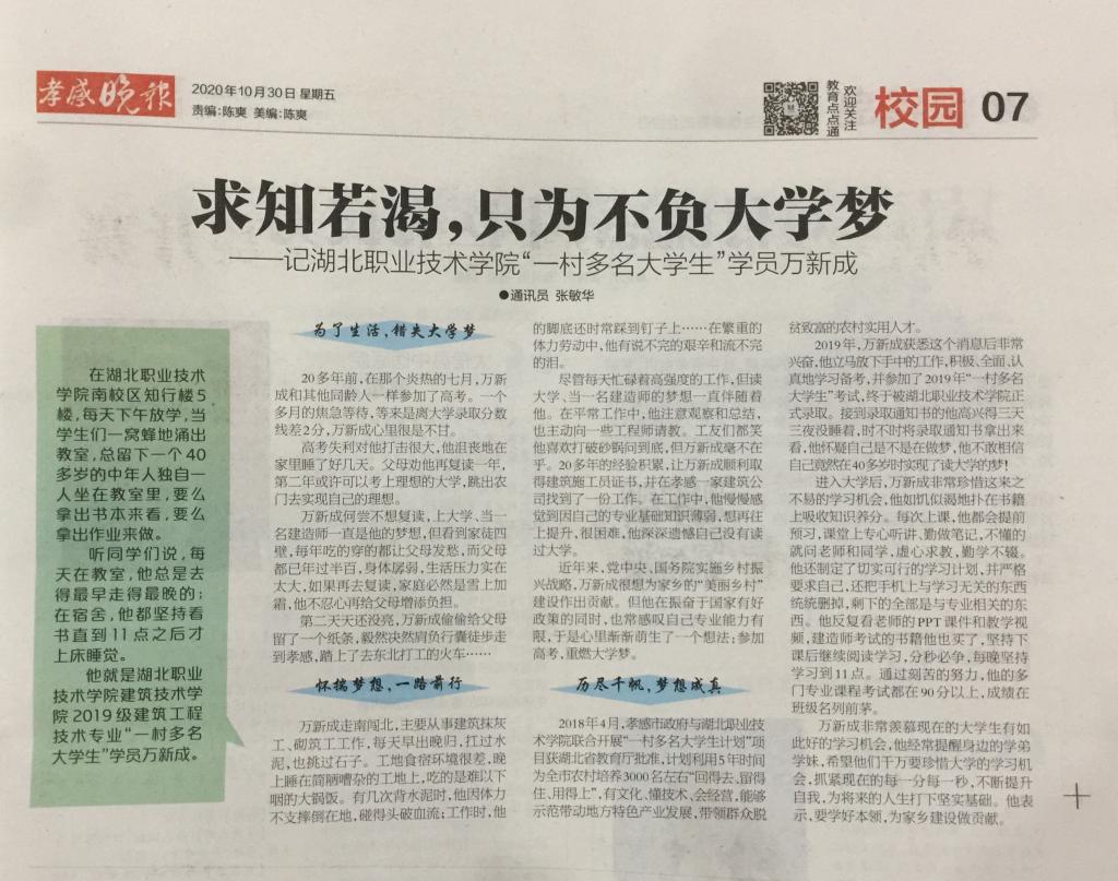 【孝感晚报】求知若渴,只为不负大学梦——记多宝网页版“一村多名大学生”学员万新成
