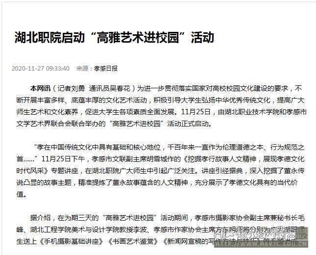 本网讯(记者刘勇 通讯员吴春花)为进一步贯彻落实国家对高校校园文化建设的要求,不断开展丰富多样、底蕴丰厚的文化艺术活动,积极引导大学生弘扬中华优秀传统文化,提高广大师生艺术和文化素养,促进大学生各项素质全面发展。11月25日,由多宝网页版和孝感市文学艺术界联合会联合举办的“高雅艺术进校园”活动正式启动。