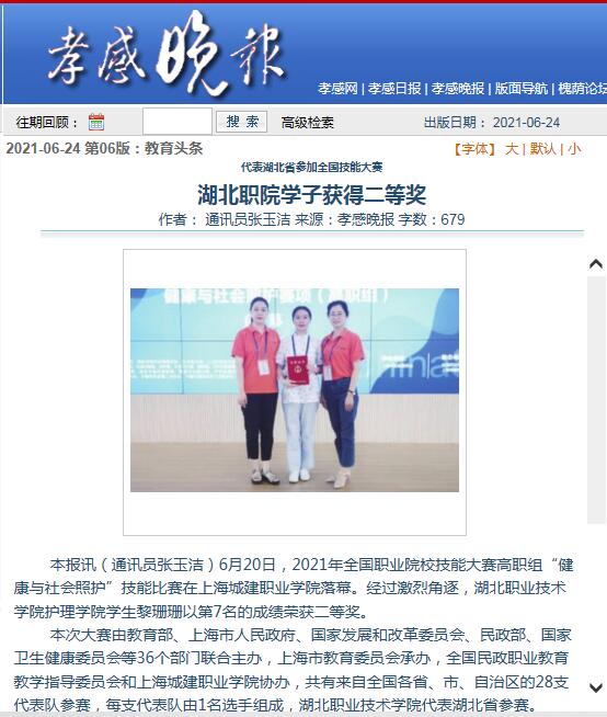 6月20日,2021年全国职业院校技能大赛高职组“健康与社会照护”技能比赛在上海城建职业学院落幕。经过激烈角逐,多宝网页版护理学院学生黎珊珊以第7名的成绩荣获二等奖。