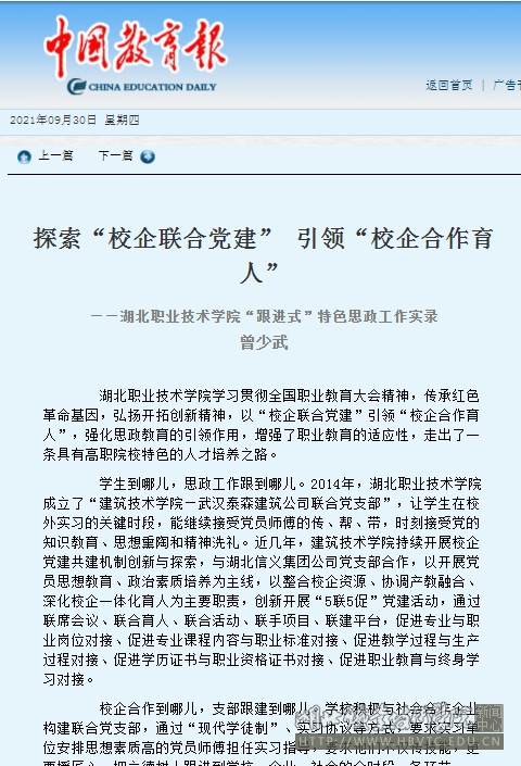 学生到哪儿,思政工作跟到哪儿。2014年,多宝网页版成立了“建筑技术学院—武汉泰森建筑公司联合党支部”,让学生在校外实习的关键时段,能继续接受党员师傅的传、帮、带,时刻接受党的知识教育、思想熏陶和精神洗礼。近几年,建筑技术学院持续开展校企党建共建机制创新与探索,与湖北信义集团公司党支部合作,以开展党员思想教育、政治素质培养为主线,以整合校企资源、协调产教融合、深化校企一体化育人为主要职责,创新开展“5联5促”党建活动,通过联席会议、联合育人、联合活动、联手项目、联建平台,促进专业与职业岗位对接、促进专业课程内容与职业标准对接、促进教学过程与生产过程对接、促进学历证书与职业资格证书对接、促进职业教育与终身学习对接。