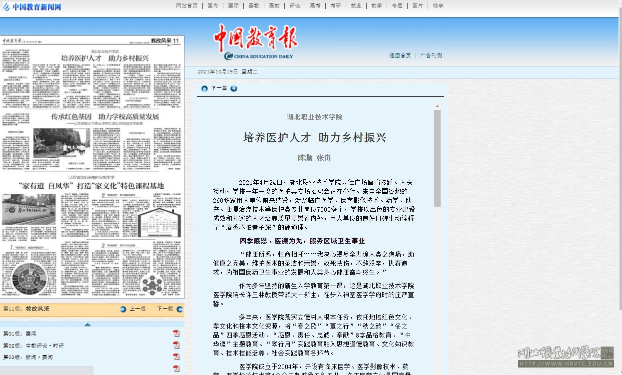 多年来,医学院落实立德树人根本任务,依托地域红色文化、孝文化和校本文化资源,将“春之歌”“夏之行”“秋之韵”“冬之品”四季感恩活动、“感恩、责任、忠诚、奉献”8字品格教育、“中华魂”主题教育、“孝行月”实践教育融入思想道德教育、文化知识教育、技术技能培养、社会实践教育各环节。