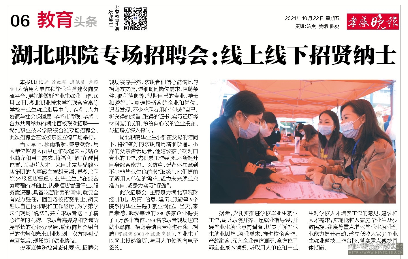 此次招聘会,主要是为湖北职院财经、机电、教育、信息、建筑、旅游等6个院系的毕业生提供就业岗位。当天,来自孝感、武汉等地的280多家企业提供了1万多个岗位,453名求职者现场达成就业意向。招聘会结束后将进行线上招聘(可提供6000个就业岗位),毕业生可以网上投递简历,与用人单位双向电子签约。