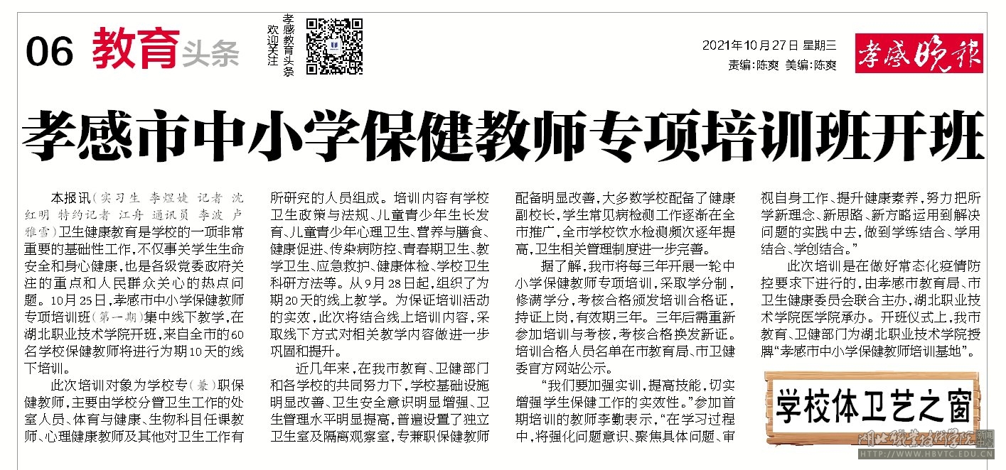 本报讯(实习生 李煜婕 记者 沈红明 特约记者 江舟 通讯员 李波 卢雅雪)卫生健康教育是学校的一项非常重要的基础性工作,不仅事关学生生命安全和身心健康,也是各级党委政府关注的重点和人民群众关心的热点问题。10月25日,孝感市中小学保健教师专项培训班(第一期)集中线下教学,在多宝网页版开班,来自全市的60名学校保健教师将进行为期 10 天的线下培训。