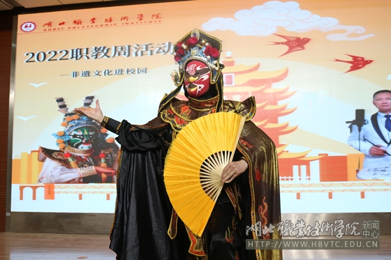非遗文化进校园是该校2022年职教周活动的一部分。当日下午,该校特邀“湖北鼓王”张明智的关门弟子、湖北省戏剧家协会会员、湖北省曲艺家协会会员、云梦县楚剧团青年演员陈加平,为师生表演了川剧《变脸》,并演唱了湖北大鼓《湖职防疫信心强》。