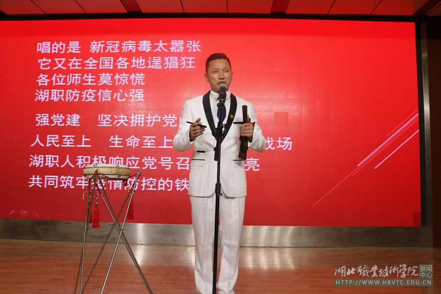 该校特邀“湖北鼓王”张明智的关门弟子、湖北省戏剧家协会会员、湖北省曲艺家协会会员、云梦县楚剧团青年演员陈加平,为师生们登台表演了川剧《变脸》,并演唱了原创湖北大鼓《湖职防疫信心强》。