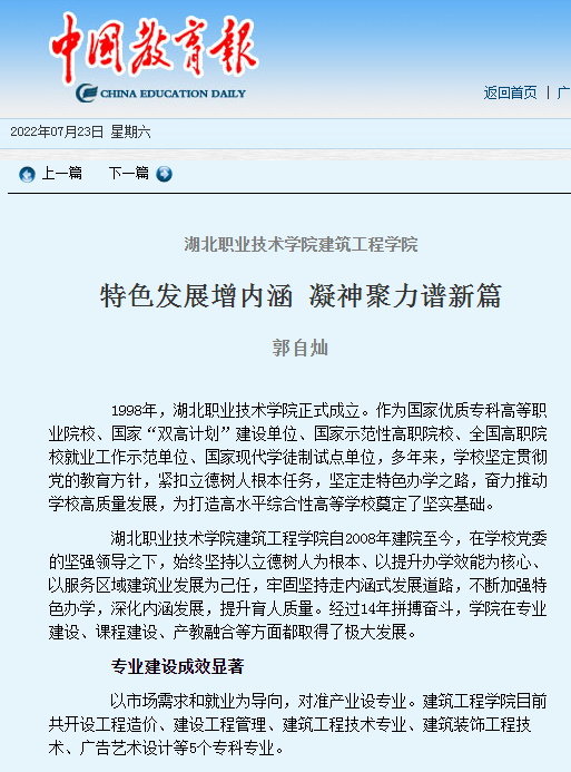 2020年,建筑工程学院组建了以建筑工程技术专业为核心,以建设工程管理、工程造价、建筑装饰工程技术等专业为支撑的建筑技术专业群。2022年,这一专业群被湖北省教育部门立项为高水平专业群建设项目。