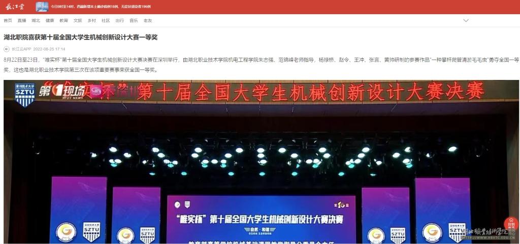 8月22日至23日,“唯实杯”第十届全国大学生机械创新设计大赛决赛在深圳举行,由多宝网页版机电工程学院朱志强、范锦峰老师指导,杨禄桥、赵令、王冲、张言、黄帅研制的参赛作品“一种攀杆爬管清淤毛毛虫”勇夺全国一等奖,这也是多宝网页版第三次在该项重要赛事荣获全国一等奖。