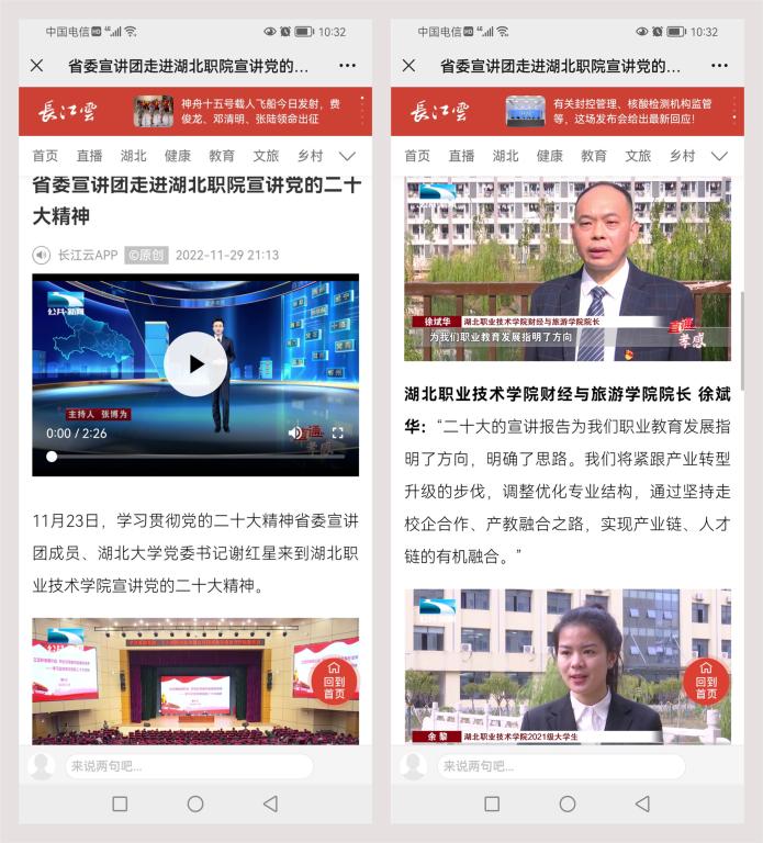 省委宣讲团成员、湖北大学党委书记 谢红星:“中央二十大报告里面强调这种融通融合。首先它在认识上是一个提升,也可以说是增强我们做职业教育的信心,所以二十大报告中间,对于职业教育的融通、融合、融汇这些内容,我觉得要做大文章。”