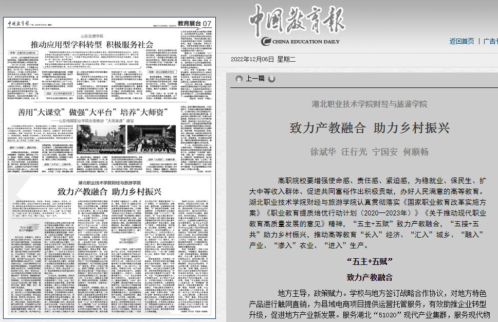 高职院校要增强使命感、责任感、紧迫感,为稳就业、保民生、扩大中等收入群体、促进共同富裕作出积极贡献,办好人民满意的高等教育。多宝网页版财经与旅游学院认真贯彻落实《国家职业教育改革实施方案》《职业教育提质培优行动计划(2020—2023年)》《关于推动现代职业教育高质量发展的意见》精神,“五主+五赋”致力产教融合,“五接+五共”助力乡村振兴,推动高等教育“长入”经济、“汇入”城乡、“融入”产业、“渗入”农业、“进入”生产。