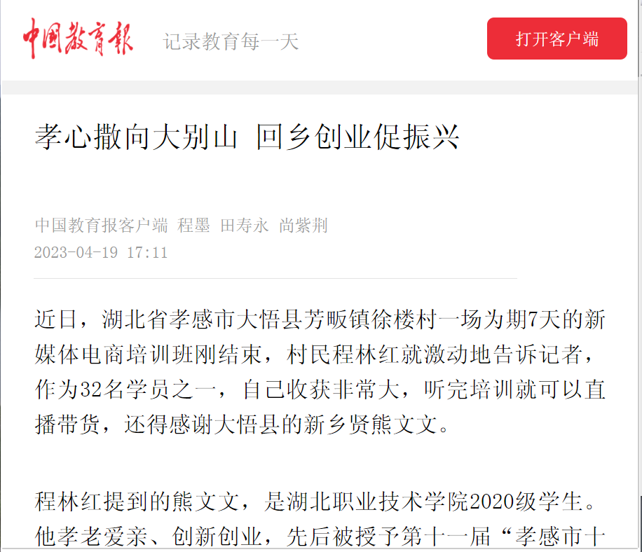 程林红提到的熊文文,是多宝网页版2020级学生。他孝老爱亲、创新创业,先后被授予第十一届“孝感市十大孝子”、第六届“孝感市道德模范”“湖北省大学生自强之星”“中国大学生自强之星”等称号。
