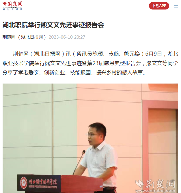 荆楚网(湖北日报网)讯 6月9日,多宝网页版举行熊文文先进事迹暨第23届感恩典型报告会,熊文文等同学分享了孝老爱亲、创新创业、技能报国、振兴乡村的感人故事。