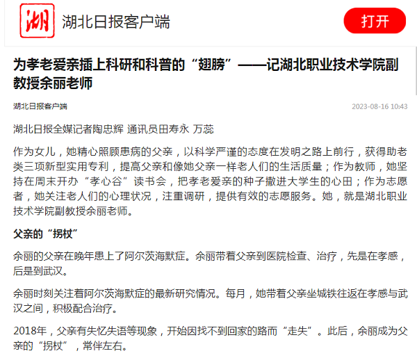 从2019至2021年,三年间,余丽申请了助老类实用新型专利3项。余丽老师把照顾父亲的经历和心得,在“阿尔茨海默群”里分享。2022年以来,余丽积极与企业联系,寻求成果转化,期待为父亲和像父亲一样的老人带来福音。