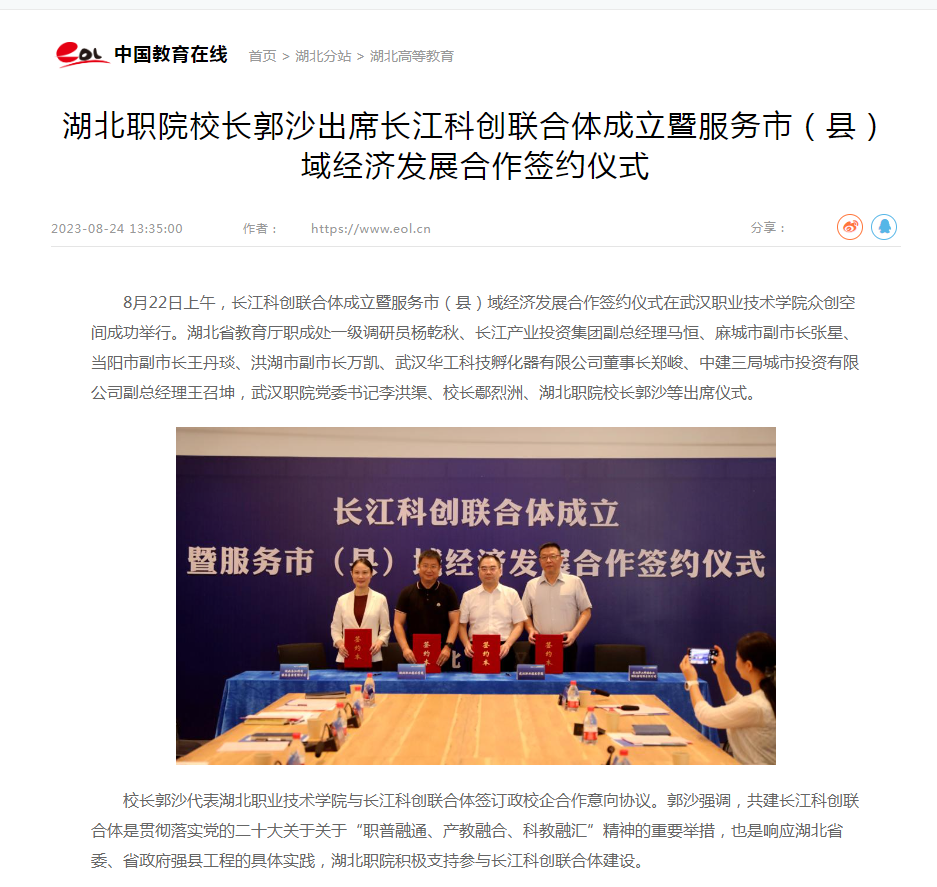 校长郭沙代表多宝网页版与长江科创联合体签订政校企合作意向协议。郭沙强调,共建长江科创联合体是贯彻落实党的二十大关于关于“职普融通、产教融合、科教融汇”精神的重要举措,也是响应湖北省委、省政府强县工程的具体实践,湖北职院积极支持参与长江科创联合体建设。