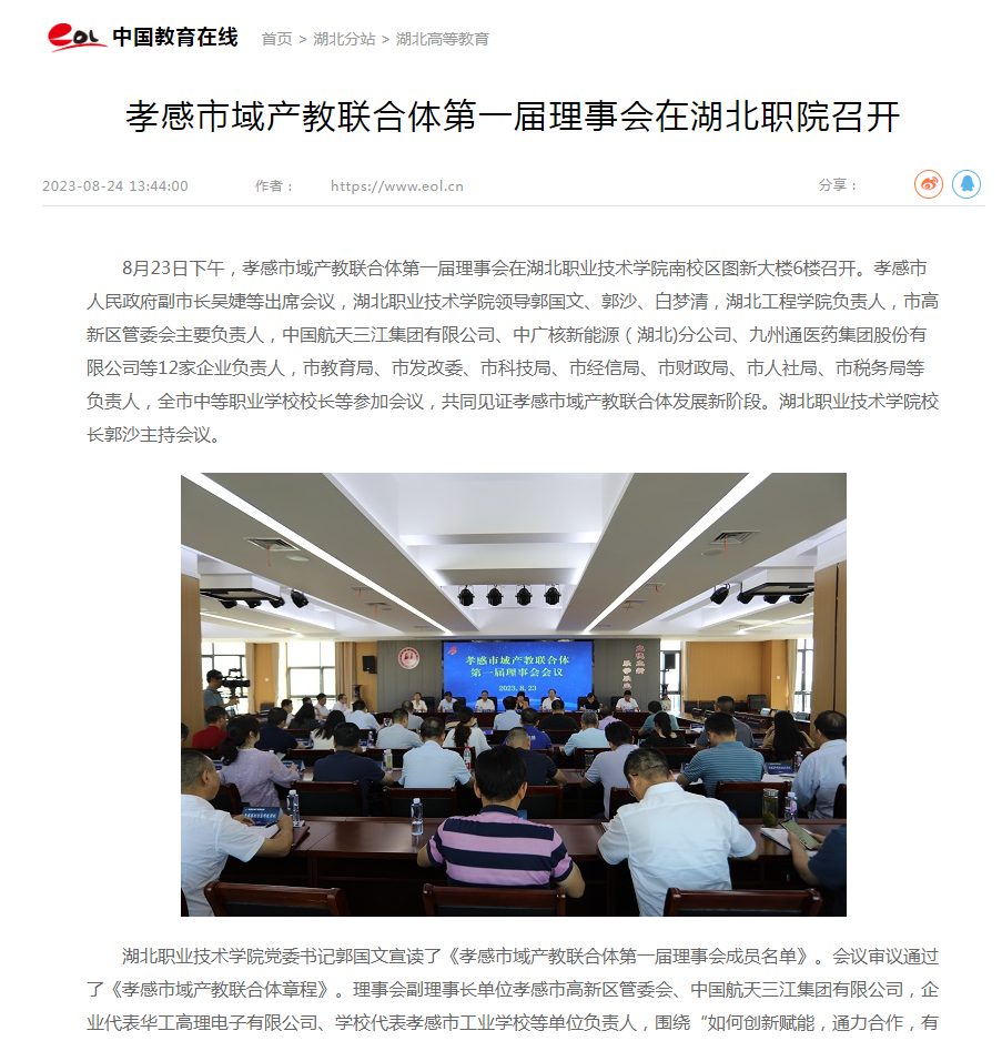 多宝网页版党委书记郭国文宣读了《孝感市域产教联合体第一届理事会成员名单》。会议审议通过了《孝感市域产教联合体章程》。理事会副理事长单位孝感市高新区管委会、中国航天三江集团有限公司,企业代表华工高理电子有限公司、学校代表孝感市工业学校等单位负责人,围绕“如何创新赋能,通力合作,有力推进联合体有序高效运转”作交流发言。