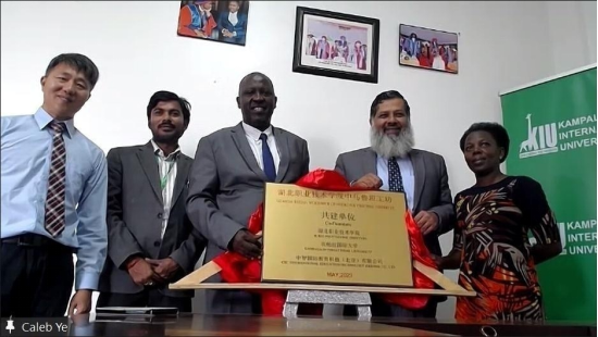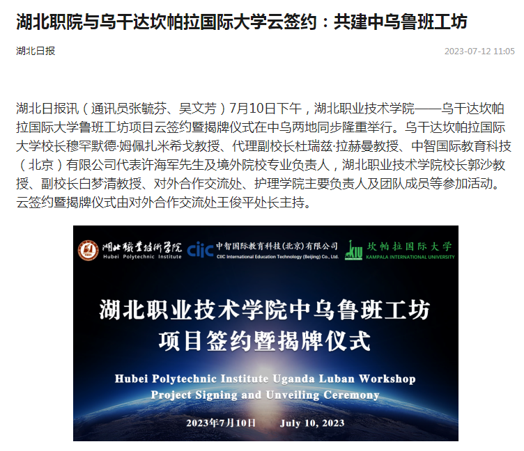 湖北日报讯 (通讯员 张毓芬 吴文芳)7月10日下午,多宝网页版——乌干达坎帕拉国际大学鲁班工坊项目云签约暨揭牌仪式在中乌两地同步隆重举行。乌干达坎帕拉国际大学校长穆罕默德·姆佩扎米希戈教授、代理副校长杜瑞兹·拉赫曼教授、中智国际教育科技(北京)有限公司代表许海军先生及境外院校专业负责人,多宝网页版校长郭沙教授、副校长白梦清教授、对外合作交流处、护理学院主要负责人及团队成员等参加活动。云签约暨揭牌仪式由对外合作交流处王俊平处长主持。