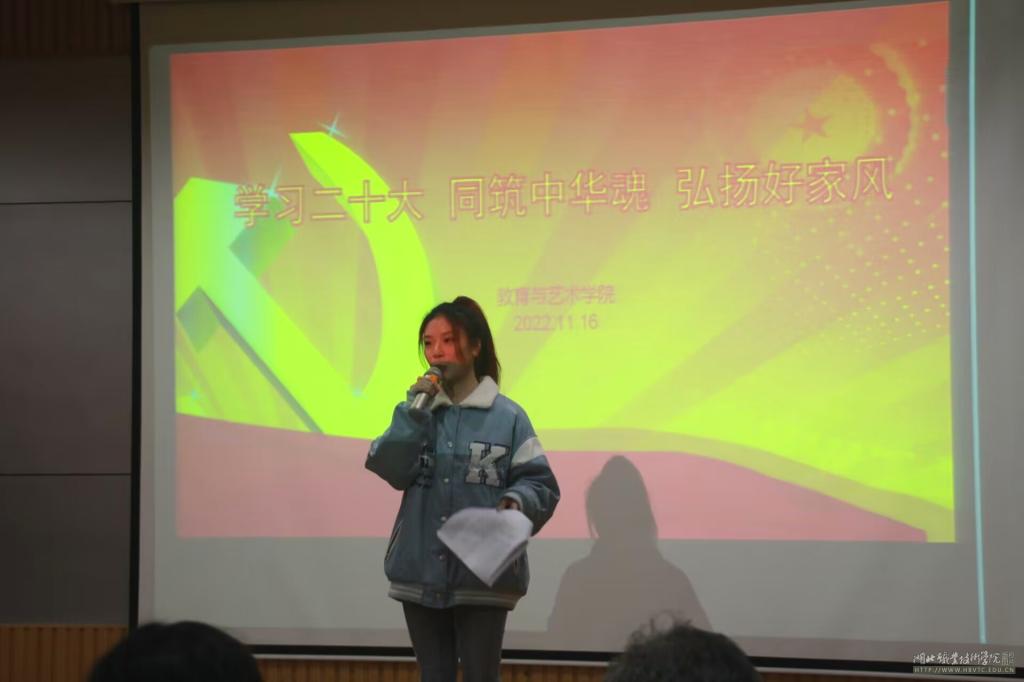 (本网讯 胡晨晨 谭畅 鲁启航)2022年11月16日晚19:00,教育与艺术学院“学习二十大 同筑中华魂 弘扬好家风”主题演讲比赛在师范校区办公楼501会议室举行,校关工委常红生主任、教育与艺术学院院长肖成林出席此次比赛,副院长张玮、副院长陈胜华、学工办赵荣华老师、周小军老师、余翠琴老师、王春老师、李璇老师担任评委。