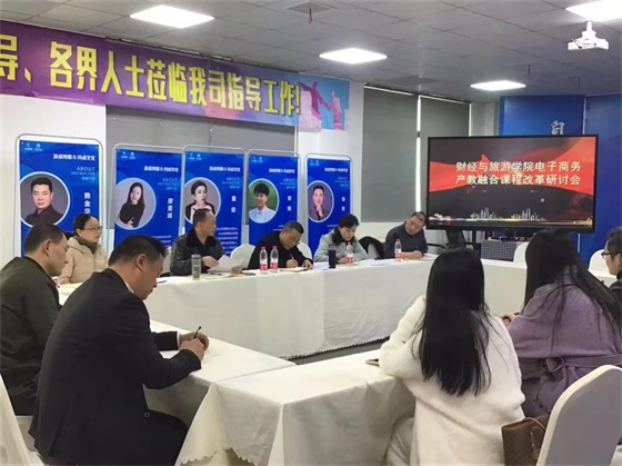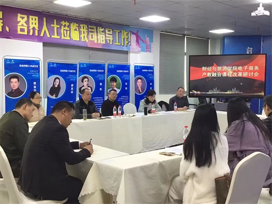 为适应产教深入融合协同发展,加快电子商务专业高质量发展,3月2日下午财经与旅游学院联合教务处在学校南区天工楼产教融合电商直播基地举行电子商务产教融合课程改革研讨会,学校教务处处长黄享苟、财经与旅游学院院长徐斌华、湖北冰点文化传播有限公司培训部负责人董少兵及学校相关工作人员参加了本次研讨会。会议由财经与旅游学院教学副院长汪行光主持。