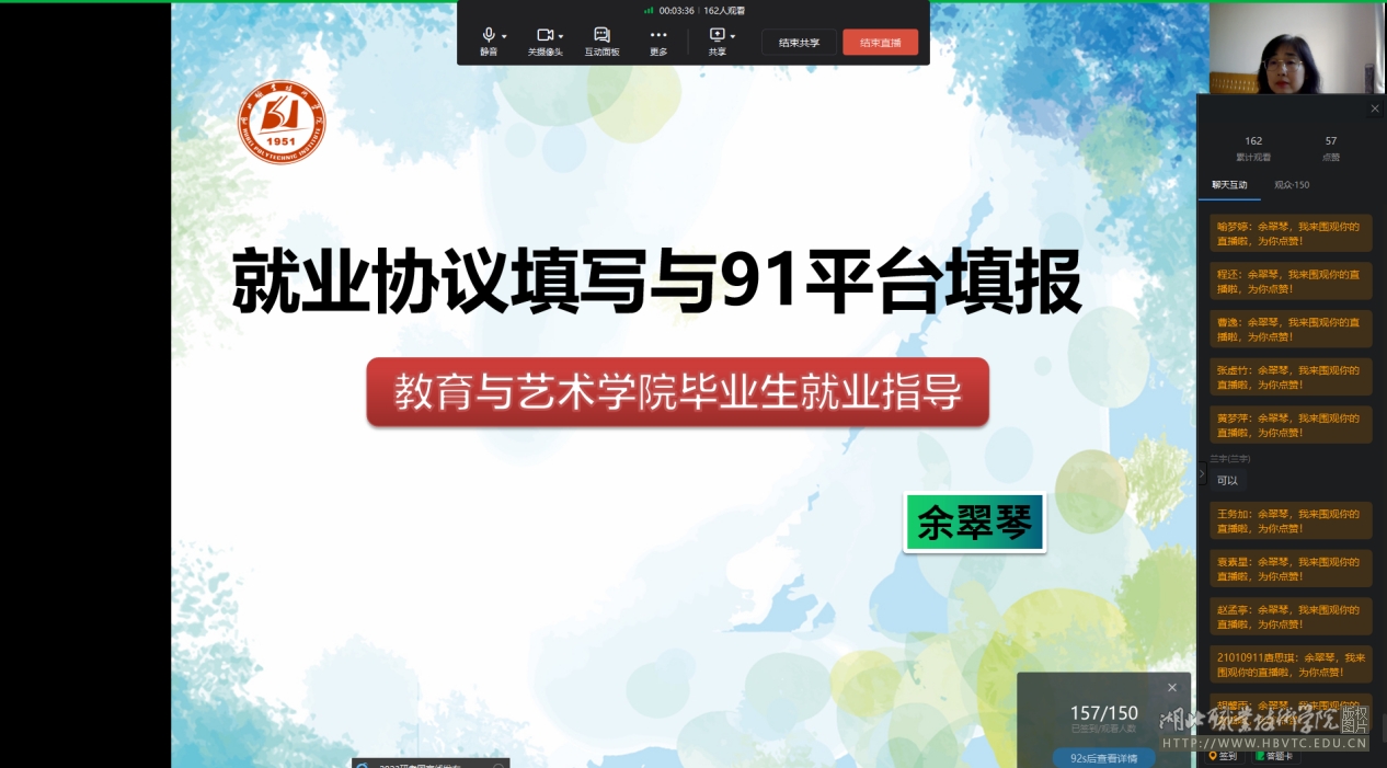 2023年3月4日上午,教育与艺术学院在线上对全体毕业生进行了《就业协议书填写和91平台填报》的培训,对学生的就业工作给出了具体指导,余翠琴老师对学生提出的问题一一给予解答。