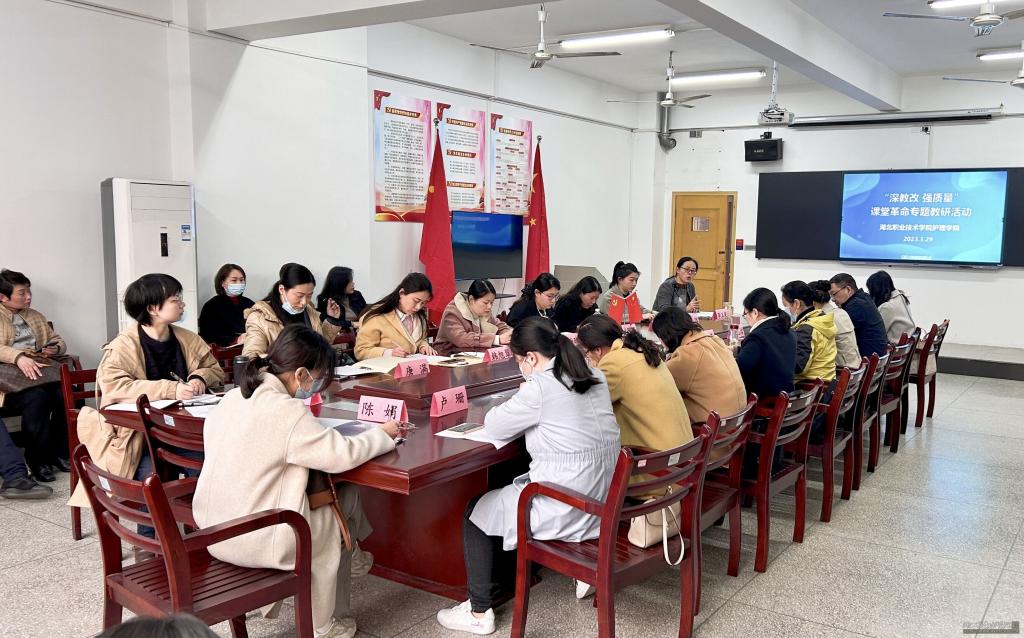 (本网讯 通讯员:镇雪婷 王蓉)为全面贯彻学校第三次党代会精神,深入落实2023年全校教职工大会工作要求,切实推进护理学院“三教改革”落地见效,实现护理专业群教育教学高质量发展,3月29日下午,护理学院在乐学楼414会议室组织开展了“深教改、强质量”课堂革命专题教研活动。学校教务处副处长刘华、口腔医学院口腔临床教研室主任叶芬,护理学院全体教师参与了此次教研活动,活动由护理学院副院长李玉荣主持。