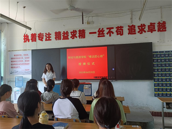 6月20日上午,财经与旅游学院在文华楼院22040102班举行“维达匠心班”授牌仪式。全国“五一”劳动奖章获得者杨晶、院党总支书记罗安文、副院长陈卫红、教学办主任刘爱华、辅导员黄曙光及全班同学参加了授牌仪式,会议由罗安文书记主持。