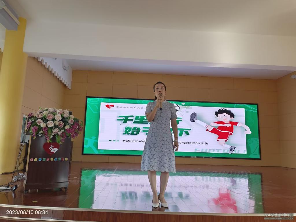 孝感市直属机关幼儿园的吴艳园长,讲解了孝感市直属机关幼儿园的创园历史,由此进入到主题活动——足球教学特色(市直机关幼儿园的特色活动)。吴艳以足球课程目标:享受乐趣、增强体质、健全人格、锤炼意志来展开她的话题,阐述了以下5个方面的内容:自上而下,足够重视;兴趣导向,足够坚持;课程多元,足够充实;环境浸润,足够走心;身心同步,足够融合。并重点讲了3—6岁儿童足球活动负面清单(包含八个方面的内容):1.禁止进行正式足球比赛。2.禁止进行成人化、专业化、小学化足球训练。3.禁止幼儿足球考级。4.禁止进行足球头球训练。5.禁止足球操等形式化表演。6.禁止所有负重的力量练习。7.禁止幼儿只练足球。8.严格控制运动时长和运动强度。为此市直机关幼儿园的老师们还共同出了一本书,此书分为大班、中班、小班三本,并赠送给其他姊妹园所,共同学习提高。