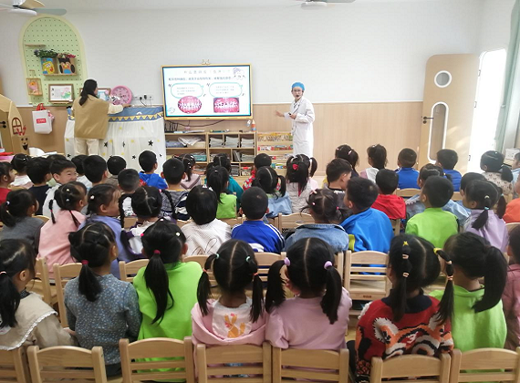 在活动现场,口腔医学院何灿老师向幼儿园师生讲解儿童口腔常见疾病龋病的发生原因,预防方法及维护口腔健康的重要性,并与幼儿园小朋友积极互动,进行有奖竞答等趣味活动。随后,口腔医学院团队对幼儿园师生进行口腔检查,普及口腔预防保健知识,进行口腔卫生宣教。