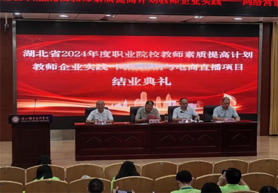(本网讯 李蓓蕾)8月9日,由我校承办的2024年湖北省职业院校教师素质提高计划项目教师企业实践(网络营销与电商直播)培训班结业典礼在学校西区文博馆学术报告厅举行。多宝网页版党委委员、副校长杨立明、财经与旅游学院院长徐斌华、党总支书记罗安文、副院长汪行光出席。结业典礼由徐斌华主持,来自全省五十余所中、高职院校的60名骨干教师参加结业典礼。